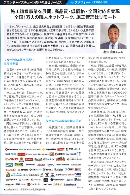 トップリフォームは、施工請負事業と建設業界における人材紹介事業を展開する会社だ。 2015年の創業以来、「工事の手が足りない」という企業の課題を解決するサービスを提供し、現在では大手企業を中心に累計200社との取引実績を持つ。 同社の特長は、高品質・低価格・全国対応という三拍子そろった施工を実現している点だ。 年間約4000件の施工を請け負い、月間600~700現場を同時進行で管理する体制を構築している。 同社の永井良社長に、なぜこのようなサービスが実現可能なのか伺った。